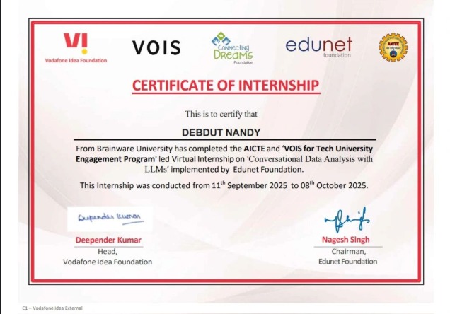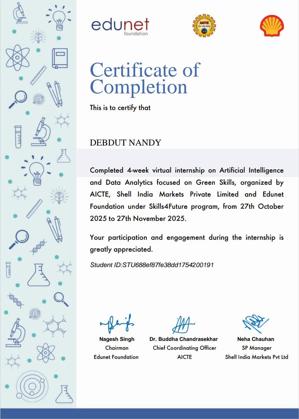 • I’ve completed AICTE-approved internships on Conversational Data Analysis using LLMs and Artificial Intelligence with Green Skills through Edunet Foundation, where I am gaining practical experience in applying AI models to real-world datasets.